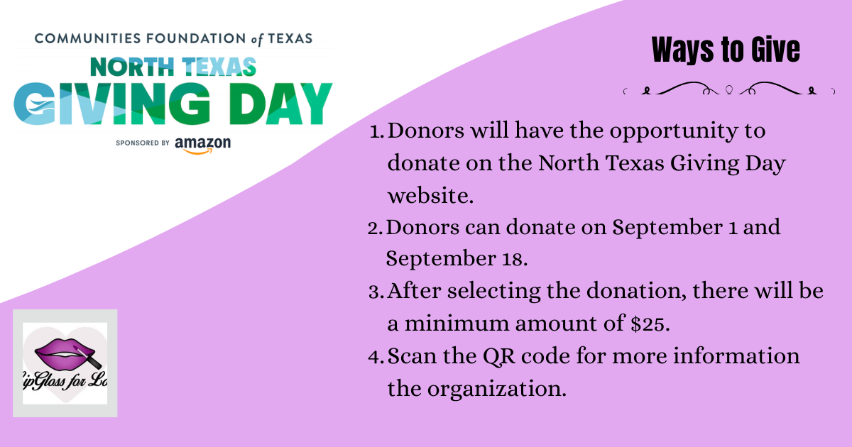 Click the link to donate https://www.northtexasgivingday.org/organization/lipglossforlove